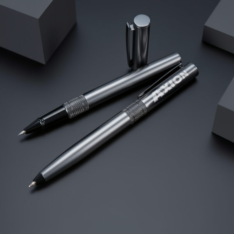 Black Metal Pen Set built for professionals who value quality, performance, and premium design. This elegant pen duo features a matte finish black metal body and smooth Blue German Ink, making it an excellent choice for corporate gifts for clients and branded office accessories in Qatar. The set includes a Roller Pen with a cap and a Ball Pen with a twist action mechanism, both offering a clean writing experience and refined executive appeal.